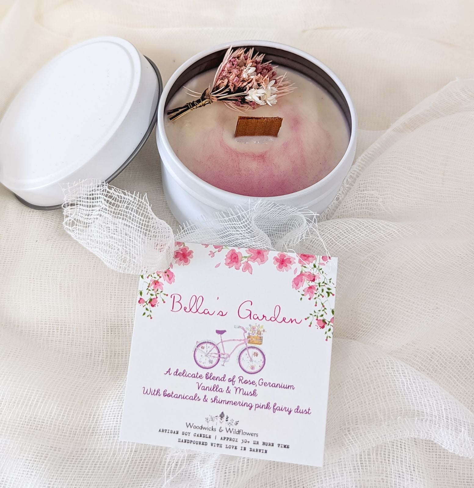 Bring the feeling of a blooming garden into your home with Bella's Garden Candle. Handcrafted with care, this artisan wood wick soy candle comes in a white ceramic bowl, and is wrapped in muslin and presented in a gift box. With its blend of rose, geranium, vanilla and musk scents, this candle will transport you to a whimsical world where you are surrounded by nature.