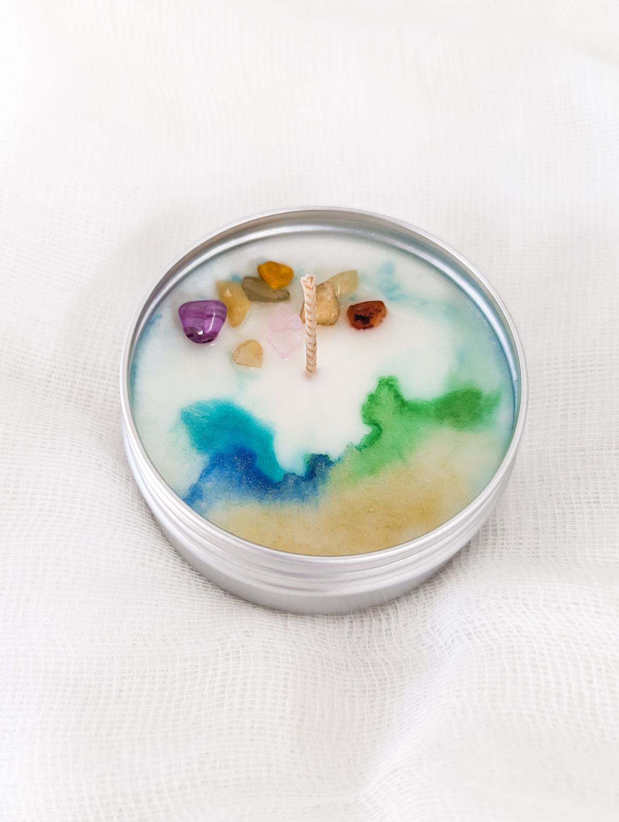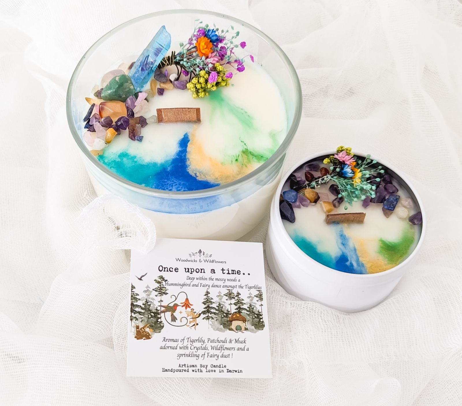 **Please read the candle card provided noting larger items are to be removed prior to lighting, they are an additional component to be removed and enjoyed such as our sage smudge sticks, mini wire wrapped bouquets, dried fruits and large gemstones, other smaller florals and gemstones chips will sink into the wax as it melts down.