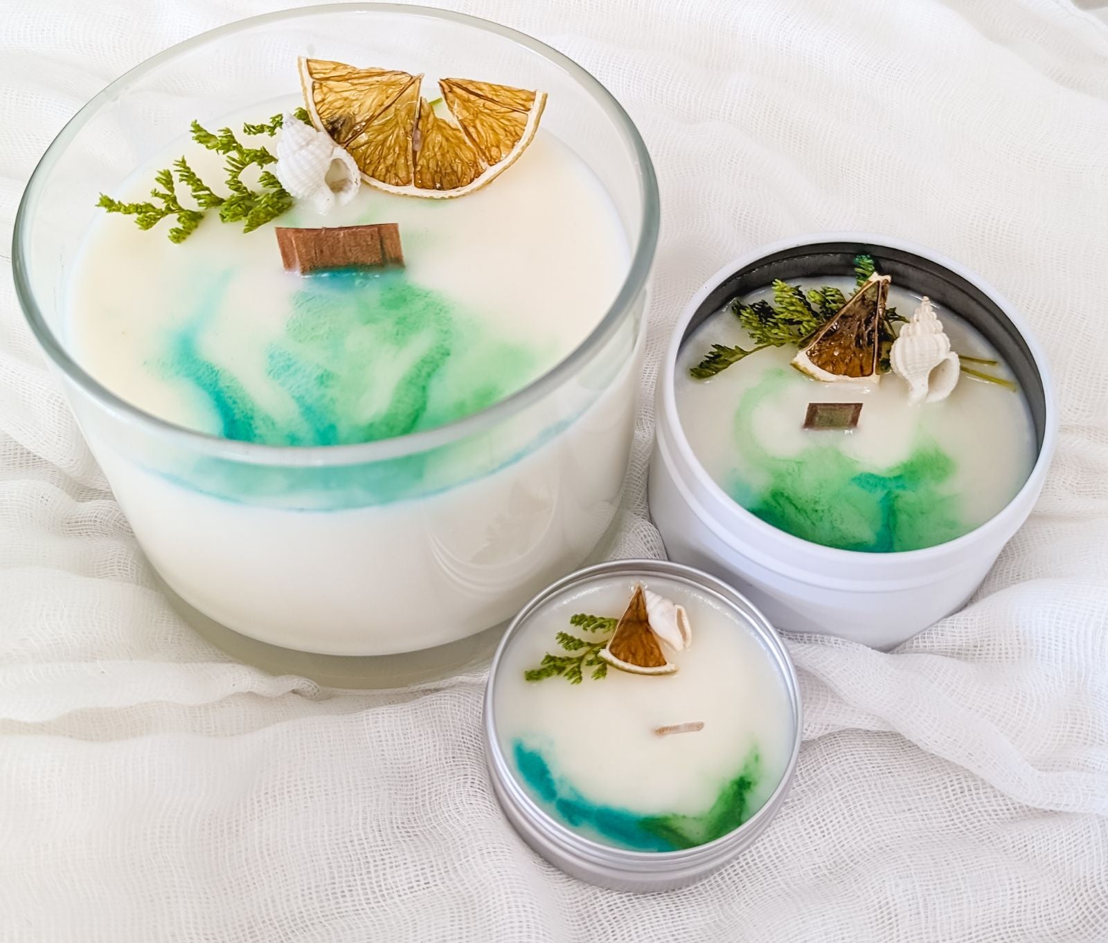 Each candle is thoughtfully adorned with dehydrated lime slices, sustainably sourced seashells, and delicate green foliage, creating a visually captivating and aromatic experience. The zesty notes of lemongrass and lime provide a revitalizing ambiance, perfect for uplifting your home or workspace.